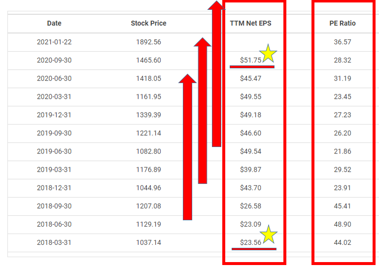 구글은 2018년에 비해 2021년 EPS(주당 순이익)을 2배 이상 끌어올렸습니다. 쉽게 말해 안그래도 돈 잘버는 기업인데 현재는 3년전보다 2배로 돈을 잘벌고 있다는 것입니다. 이렇게 EPS가 2배로 뛰어 버리니 비슷한 20~40의 PER을 가진 구글이 주가가 2배 가까이 뛰어버린 것입니다.