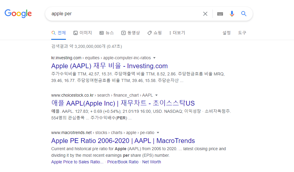 처음에 설명 했듯이 PER= 시가총액/ 당기 순이익 = 주식가격 / EPS 로 표현할 수 있습니다.